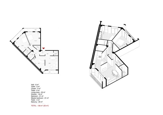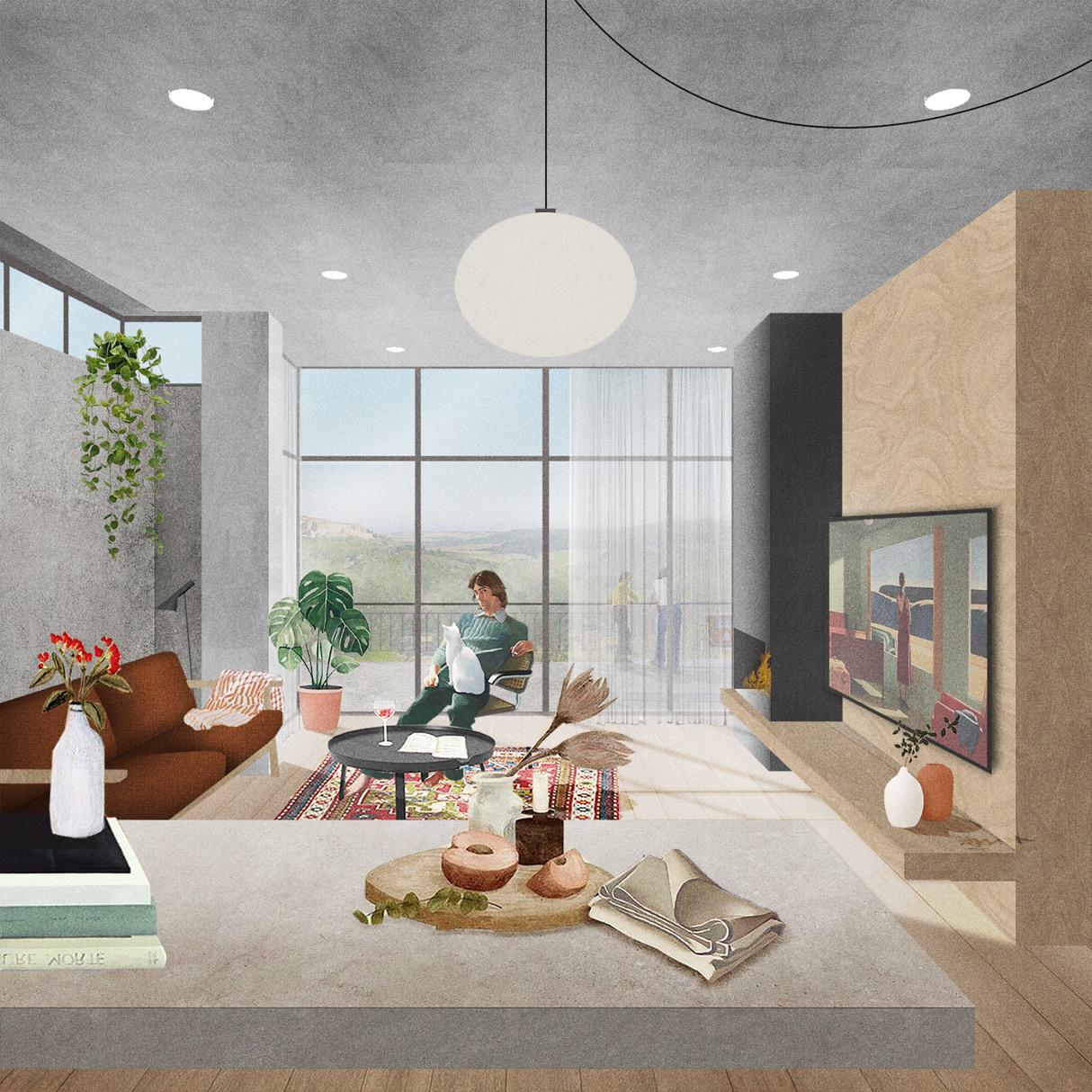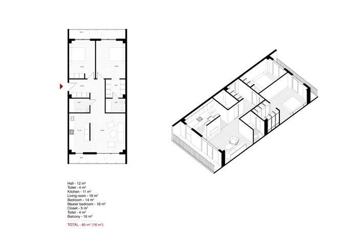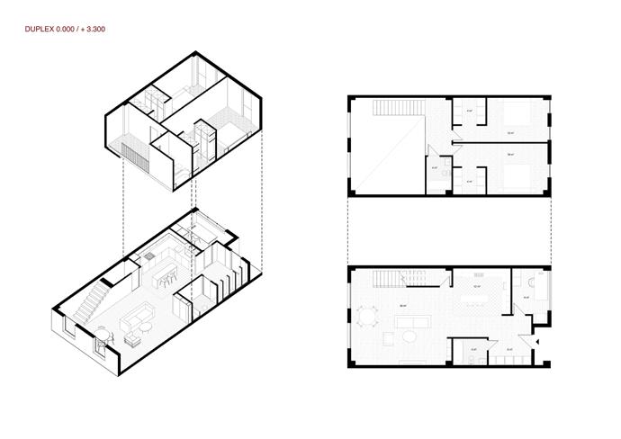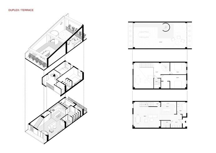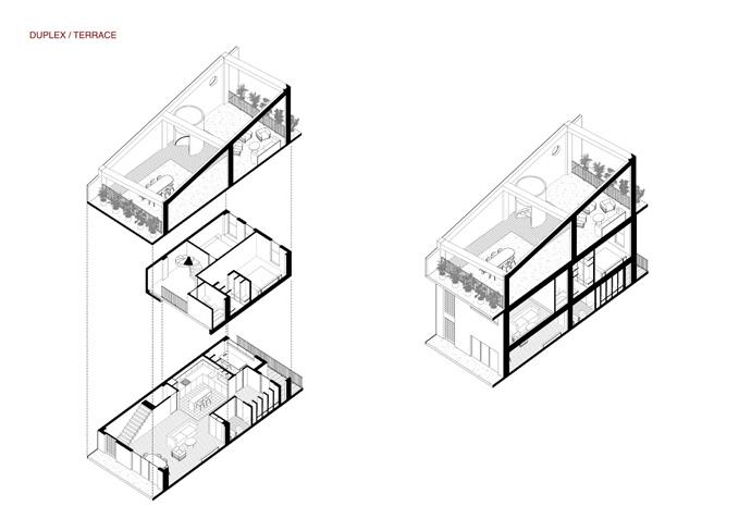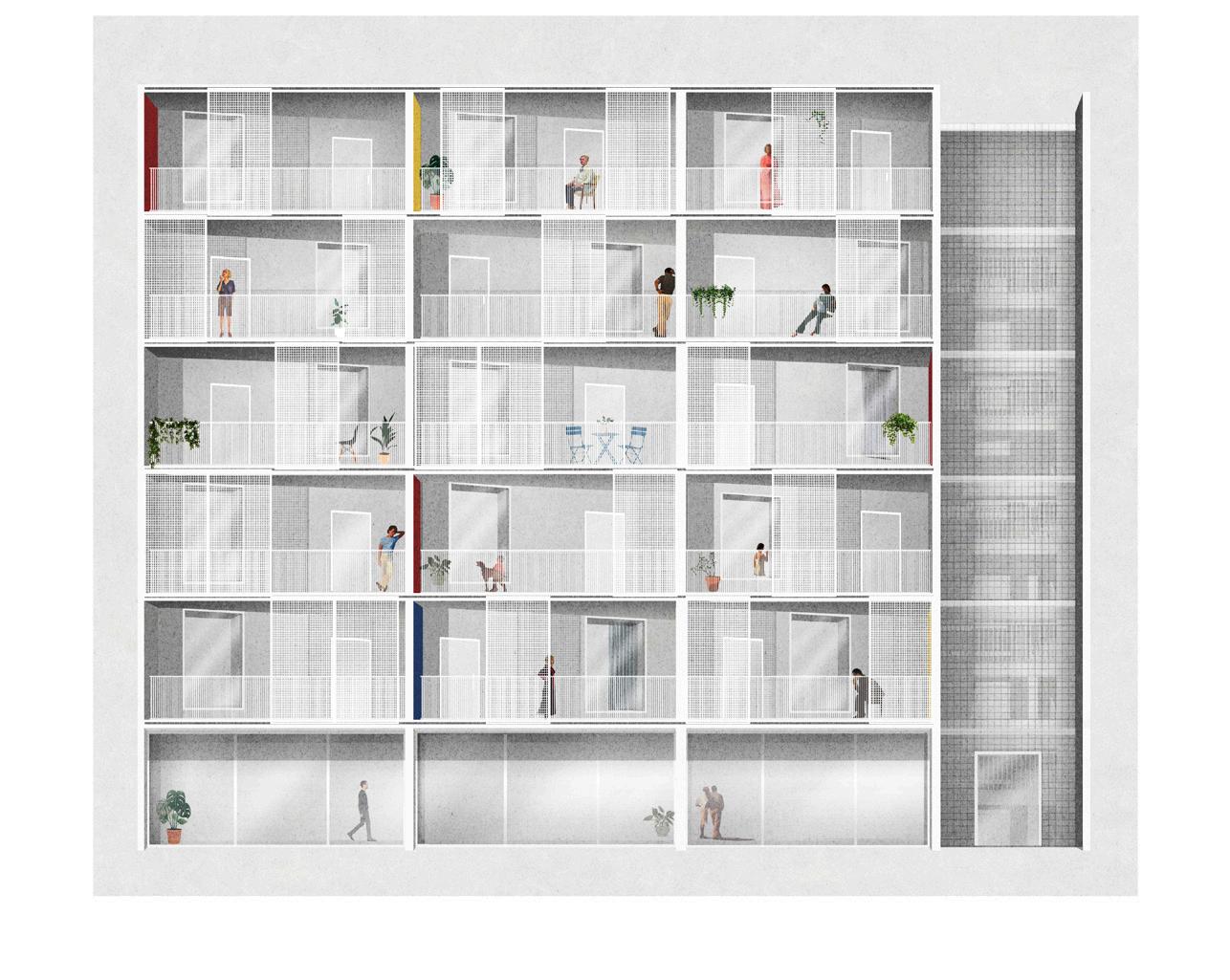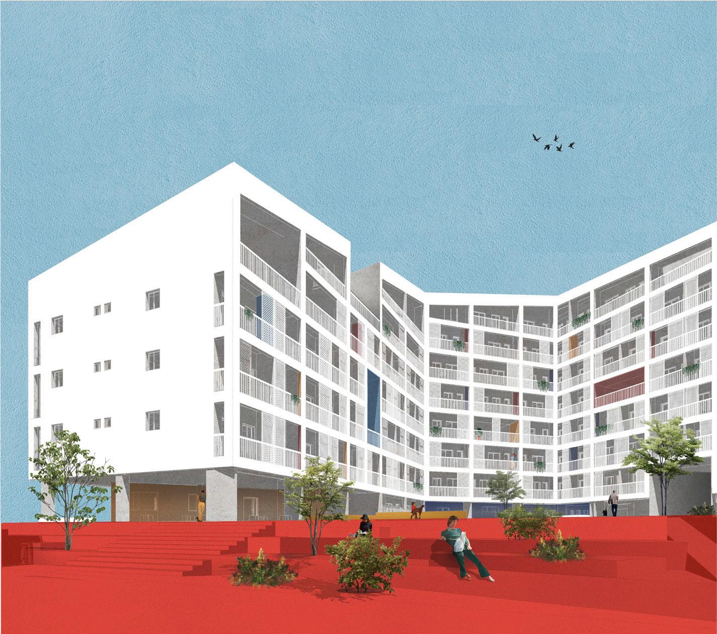 Spaces | The building is designed to house a range of apartment types, catering to different needs and preferences. It includes: Studios: Compact living spaces ideal for individuals or couples. Duplexes: Multi-level units offering more space and privacy. Townhouses: Larger, more private homes with direct access to the street.