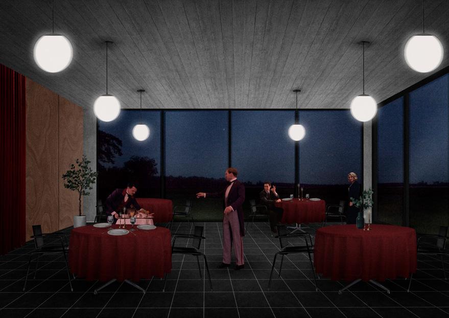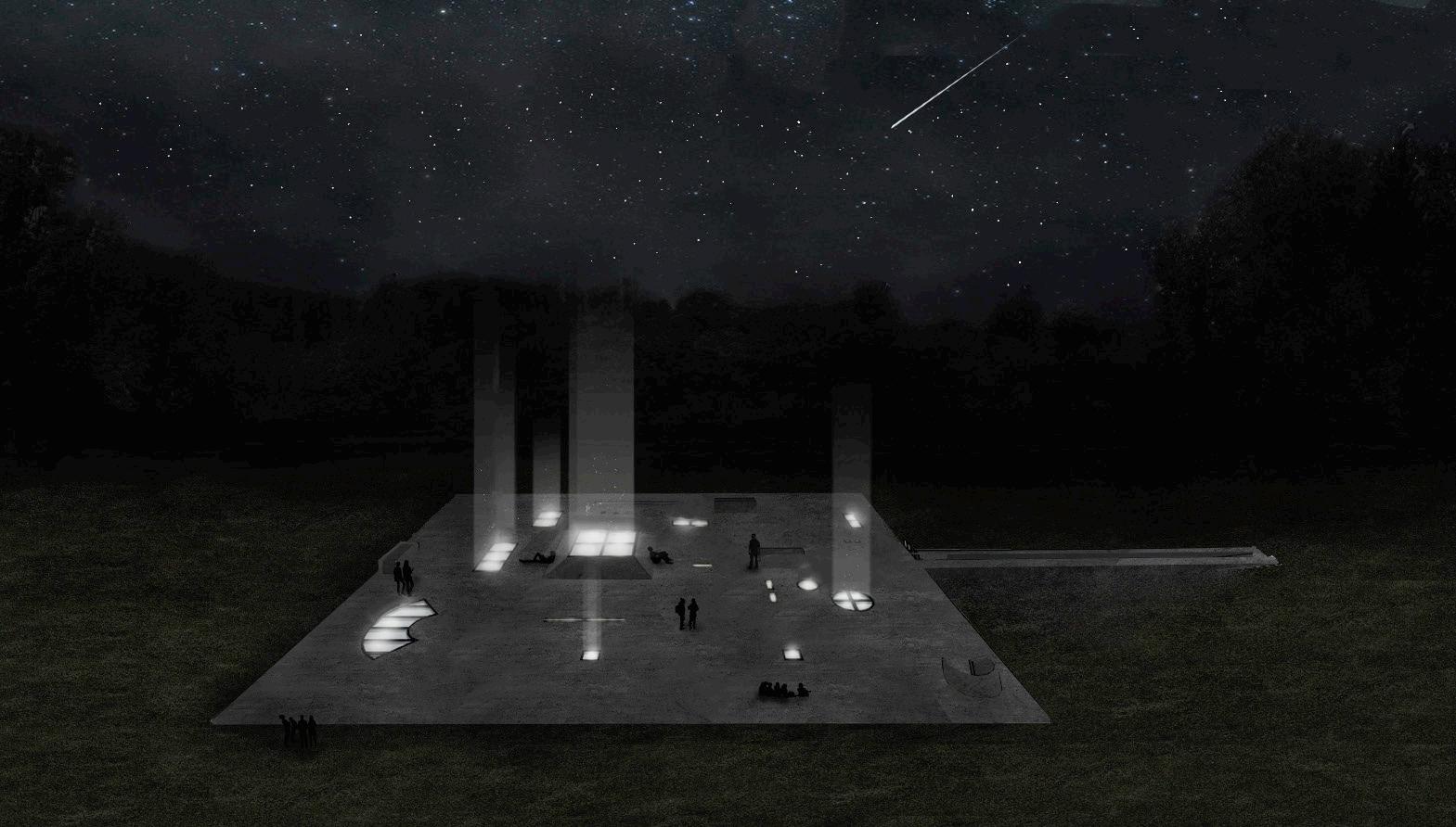 Spaces | Adjacent to the main theatre, several rehearsal rooms are dedicated to musical practice. These spaces are acoustically optimized and designed to facilitate smooth transitions between classroom learning and rehearsal activities. The layout ensures efficient flow between classrooms, rehearsal areas, and the main stage, promoting a functional and intuitive movement through the facility. A dedicated recreational area for musicians provides a space for relaxation and social interaction. The visible part of the building features a stargazing platform that transforms the space into an observational area at night. The platform is designed to offer unobstructed views of the night sky, providing a serene escape from the urban environment of Moscow. MARCH, BA2 PROJECT ,