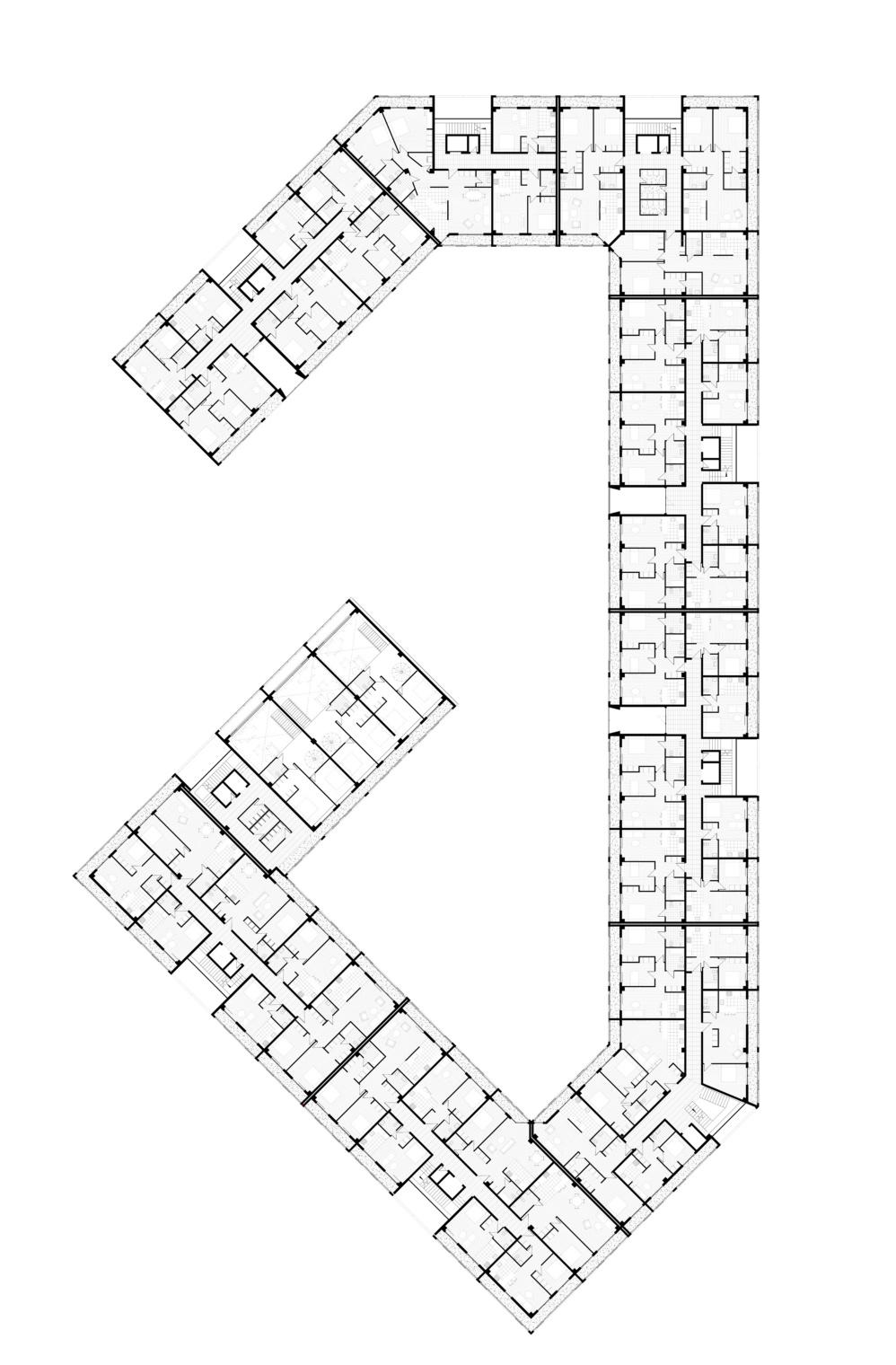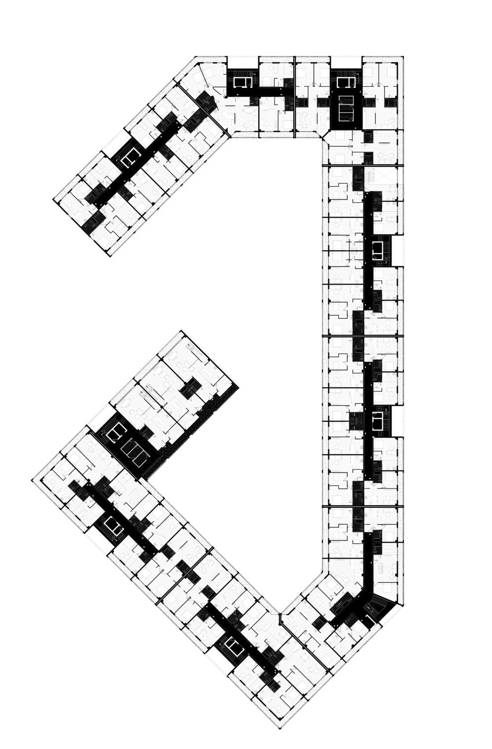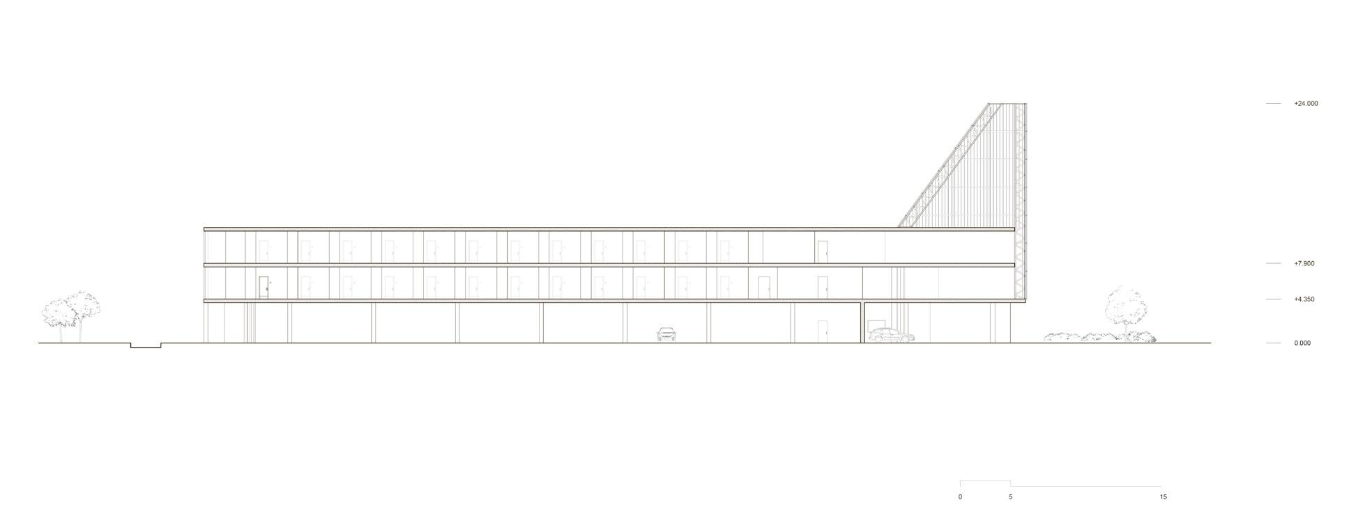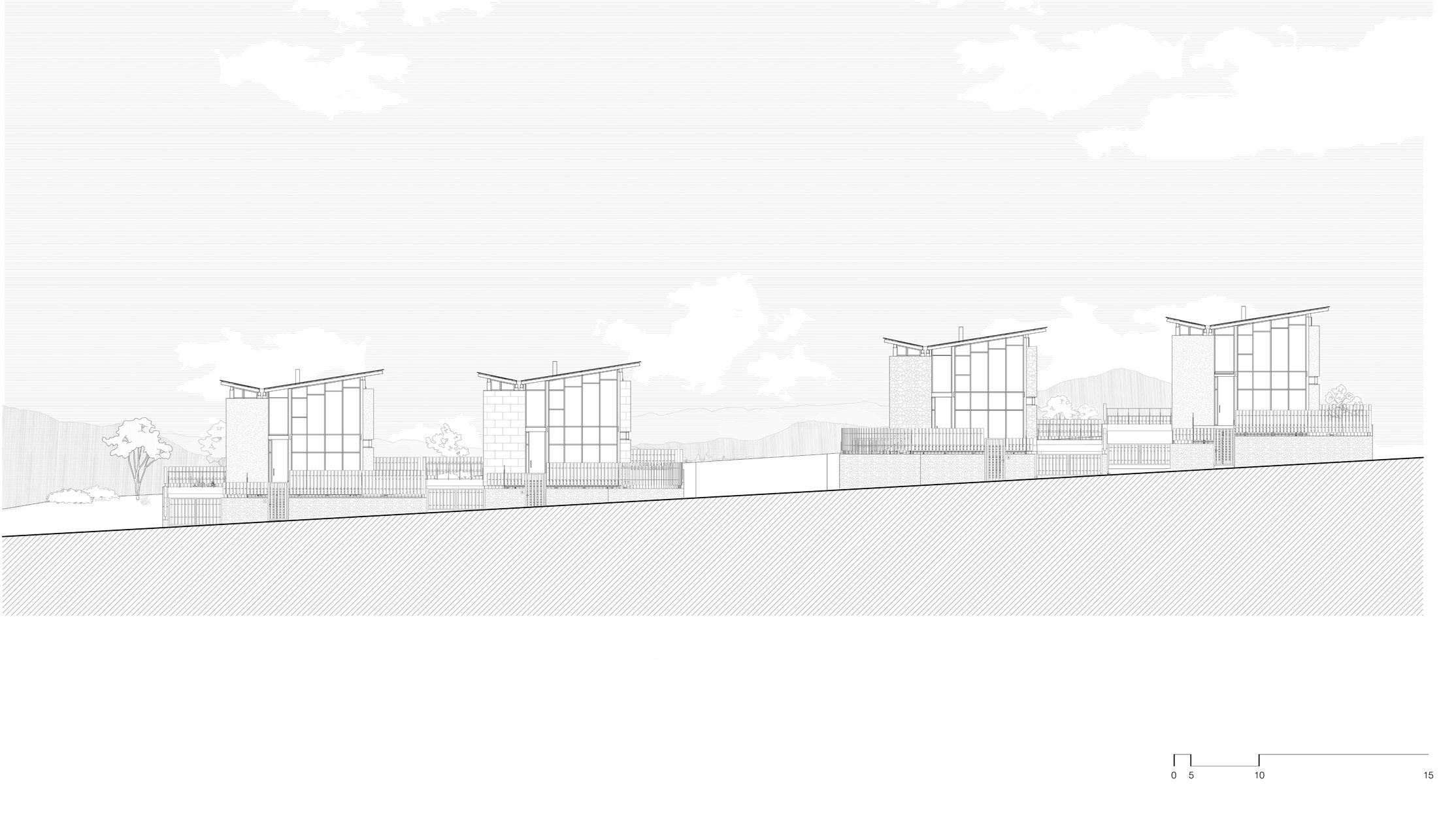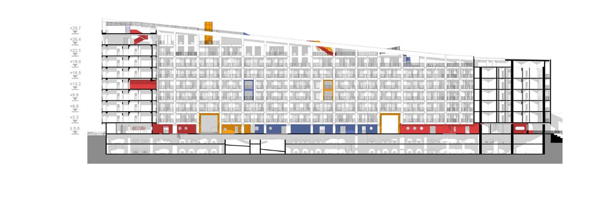 The residential complex features a single, elongated building with a dynamic roofline that slopes from south to north. The structure varies in height, reaching up to nine stories at its highest point and tapering down to five stories at the lowest. This form optimizes the use of natural light and views while responding to the site’s topography.