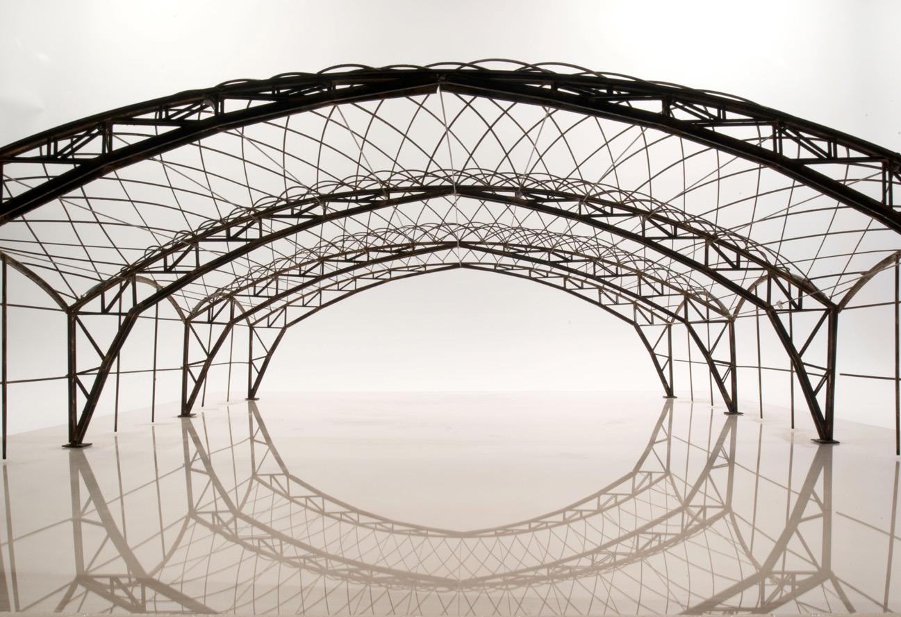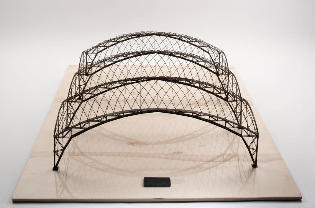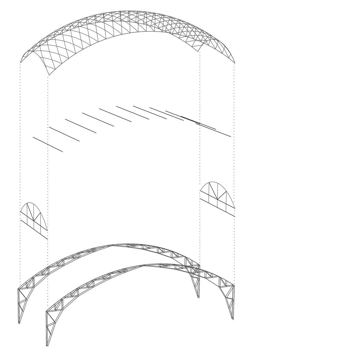 The ties within the structure, fixed transversely between adjacent main trusses, are essential in counteracting the thrust from the lattice envelope. These ties exemplify the principles of lightweight structural engineering by illustrating the closure of forces within the framework.