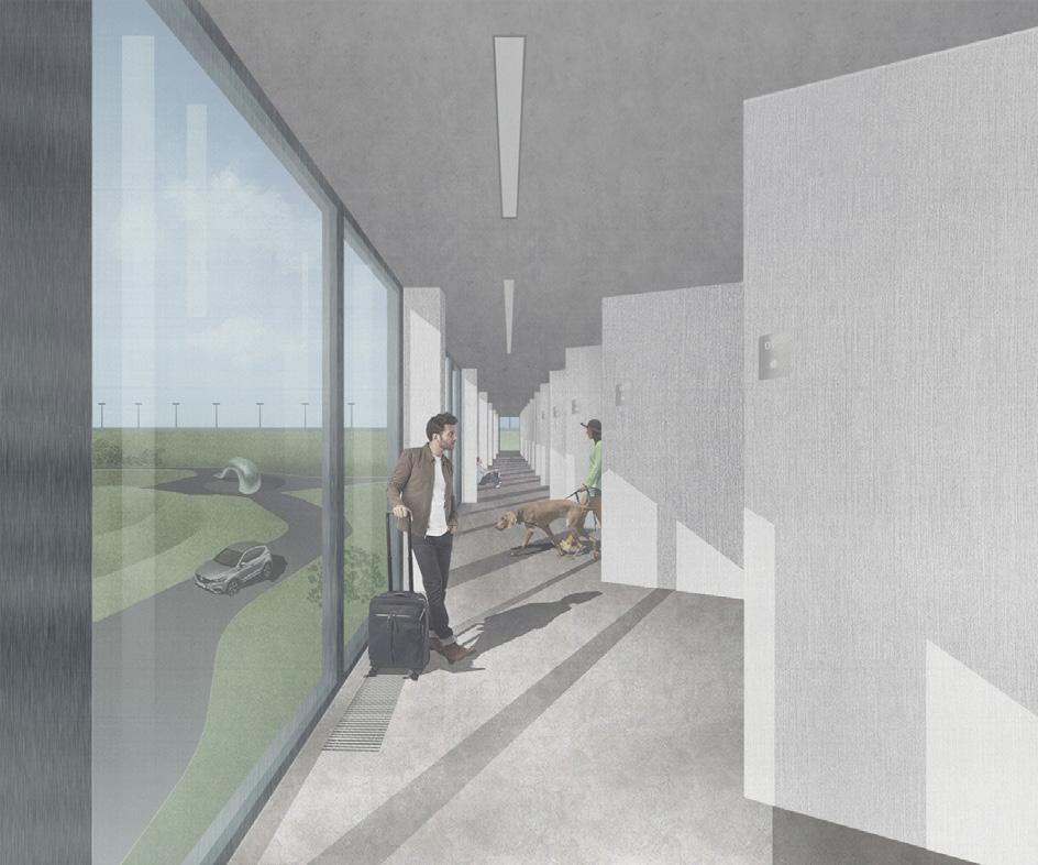 The residential block, consisting of two floors, offers 24 rooms with a total capacity up to 60-70 guests. The rooms are divided into two types: double rooms and rooms with additional beds on the second tier. The hotel’s layout ensures a comfortable and efficient accommodation experience, while the overall design maintains a permeable first floor to facilitate seamless vehicle movement and access.