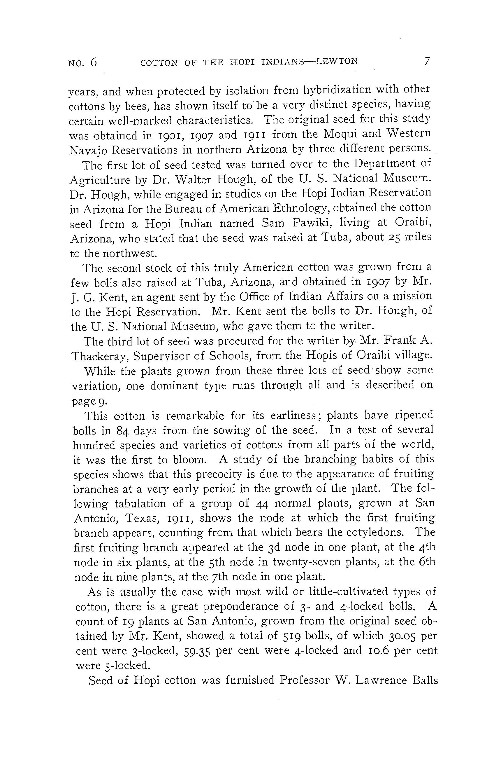 The plants studied and from which the description given on page 9 is drawn were all grown from the seed obtained by Dr. Hough and Mr. Kent from Tuba, Arizona, and Mr. Thackeray from Oraibi, to which reference has already been made. Seed of Hopi cotton was also received from Mr. C. R. Jefferis, Superintendent of the Western Navajo School at Tuba, Arizona ; from Mr. Lorenzo Hubbel, trader, of Keam's Canyon, Arizona, and from Dr. J. Walter Fewkes, of the Bureau of American Ethnology. The last lot of seed Was collected by Mr. Thos. B. Keam at Oraibi village in 1889 and was included in the Keam collection purchased by Dr. Fewkes for the Hernenway collection in the Peabody Museum at Cambridge, Mass. Other specimens of what appears to be the same cotton have been received from Mr. E. W. Hudson, at the Pima Reservation, Sacaton, Arizona ; and Mrs. Matilda Coxe Stevenson from Tonyo Camp, Espafiola, New Mexico.