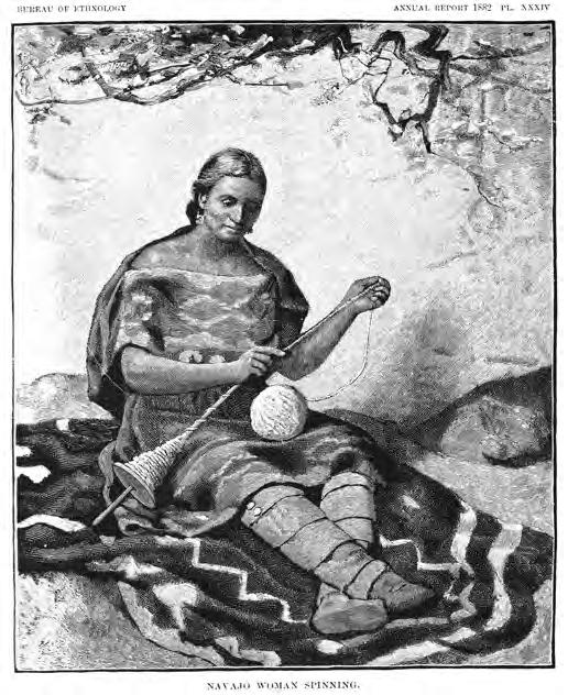 Backpiece: Dinè woman hand spinning wool, Bureau of American Ethnology Annual Report 1882, Plate XXXIV