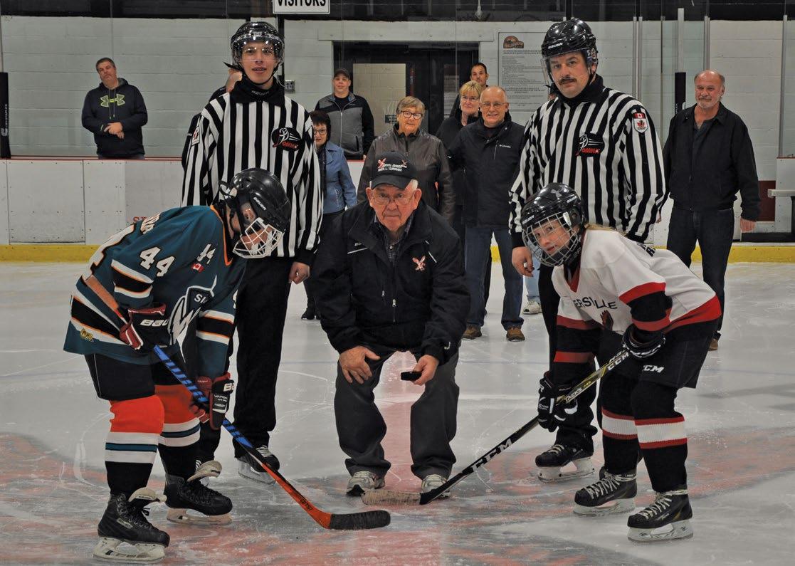 HAGERSVILLE—Murray Johnson (centre) dropped the puck at the annual tournament named in his honour prior to passing away in April 2023. —Haldimand Press archive photo.