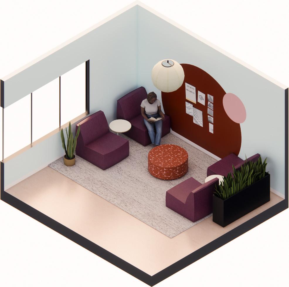 The reflection zone has the smallest footprint and biggest impact, offering a refuge for students and fostering psychological safety in the classroom. daylight + views softness +