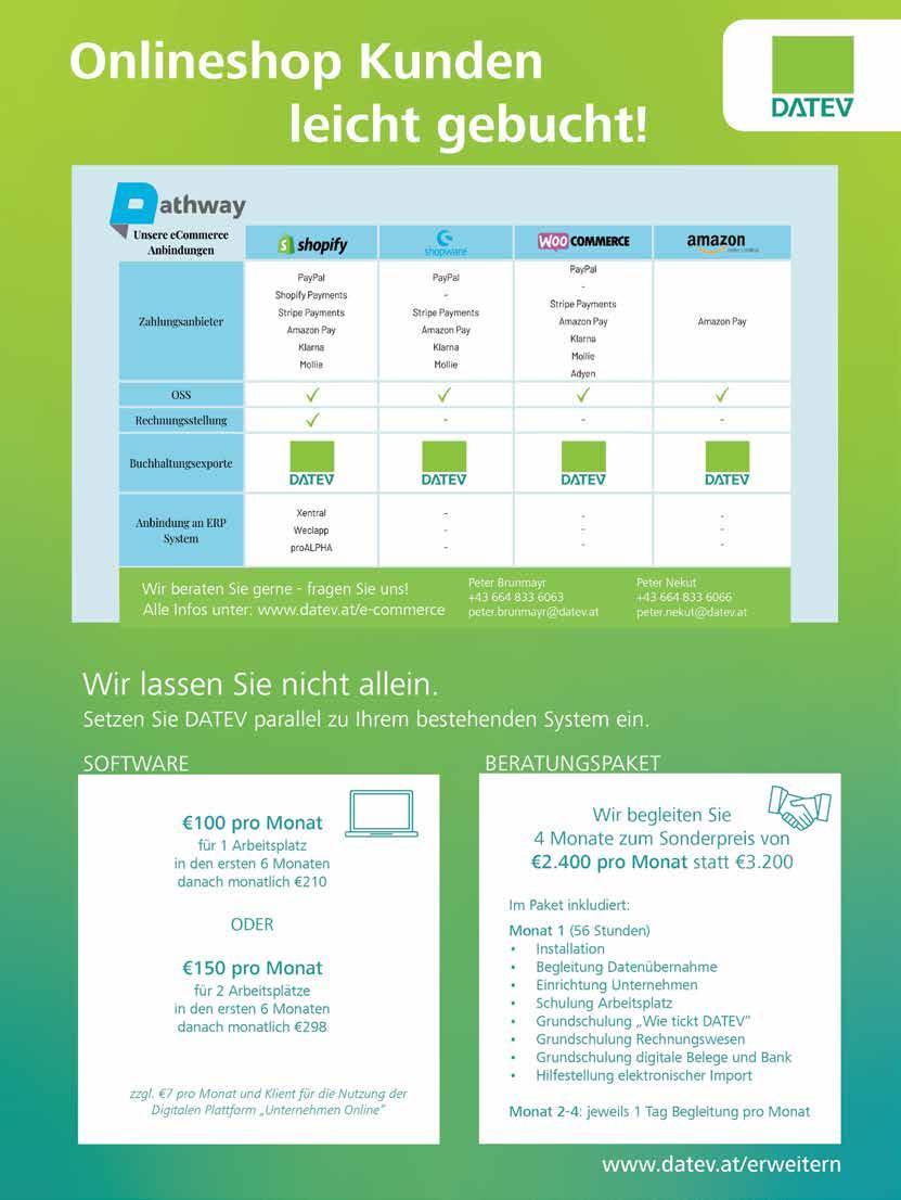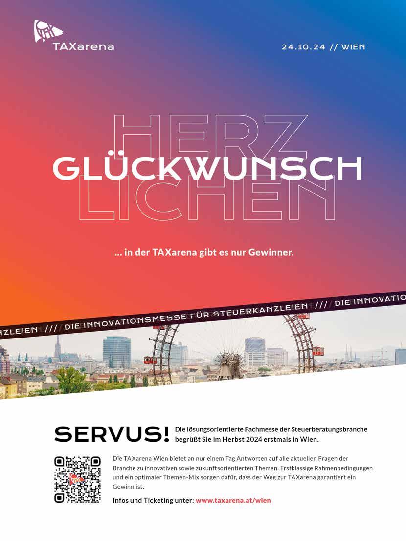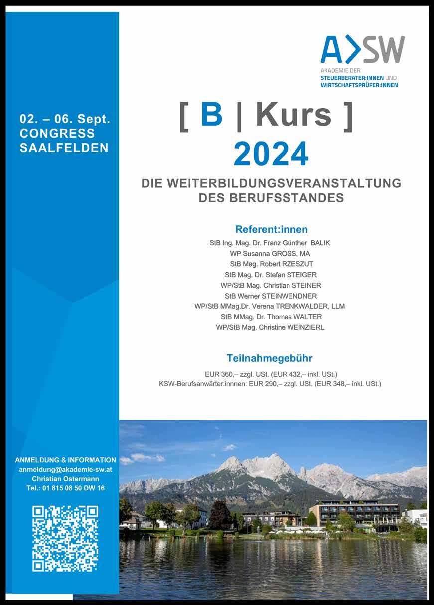 KSW update 2 | 2024, Herausgeber, Verlag, Vervielfältigung und Redaktion: Kammer der Steuerberater:innen und Wirtschaftsprüfer:innen, Am Belvedere 10 | Top 4, 1100 Wien, Tel.: 01 | 811 73, E-Mail: office@ksw.or.at, www.ksw.or.at, Verlagspostamt 1100 Wien P.b.b. Vertretungsbefugt: Präsident Mag. Herbert Houf, Unternehmensgegenstand: Vertretung und Förderung der Angehörigen der Wirtschaftstreuhandberufe in Österreich, Chefredakteurin: Mag. Christa Danner, Redaktion: Dr. Katharina Schnell, Produktion und Grafik: büro mischgo Druck: Druckerei Ferdinand Berger & Söhne GmbH, 3580 Horn. Die Datenschutzerklärung der KSW finden Sie unter www.ksw.or.at/Datenschutzerklärung