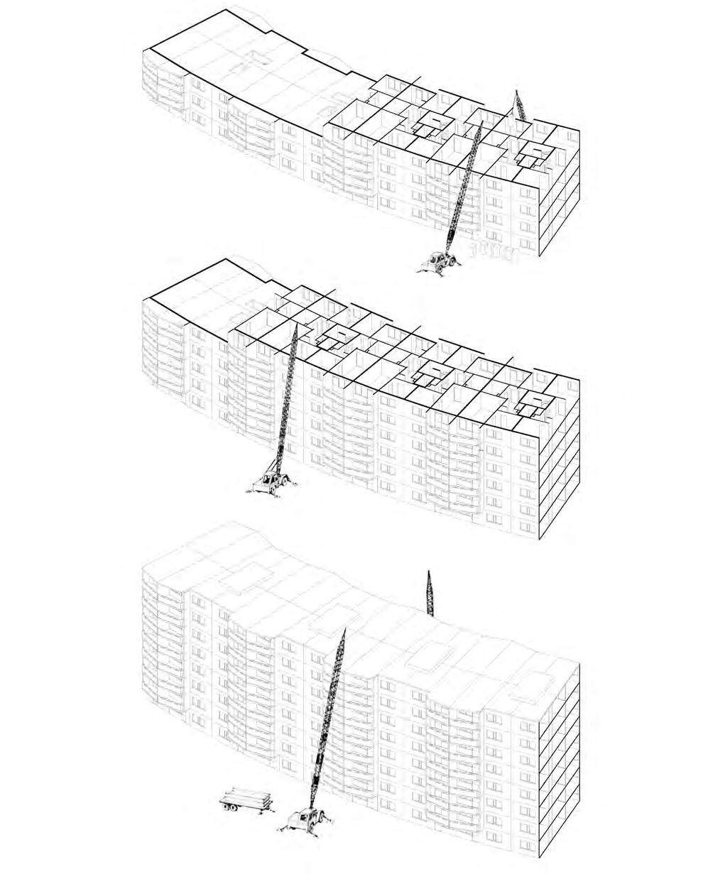 The construction was carried out simultaneously from two sides of the building. With the help of mobiles cranes, the prefabricated loadbearing elements are lifted and joined at the construction site floor by floor. Whilst the frame is raised, the cranes are also used to lift the inner walls and containers with material for the internal completion to the respective level. This process allowed to erect 5 flats in 2 days (up to 250 tons per day). A housing block with 24 flats could thus be completed in 10 days.9