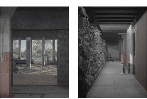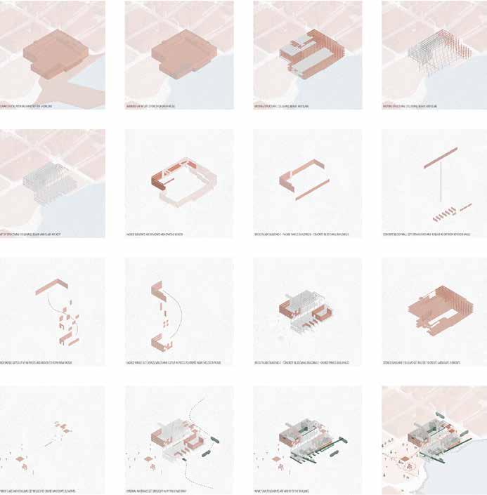 its qualities and its possibilities. Thereafter, developing a way of thinking of materials trough four categories – reusing (building kept in place), relocating (disassembled pieces to being reassembled in new ways), adding (new additions), and preserving (disassembled prices given to the center of reuse) – to create and explain the building proposal.