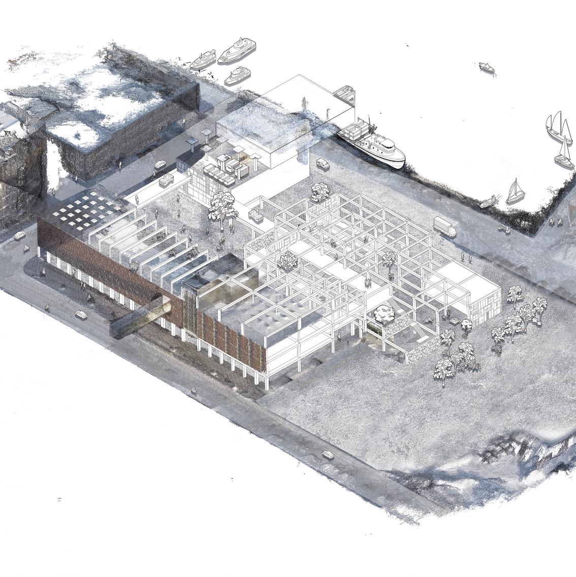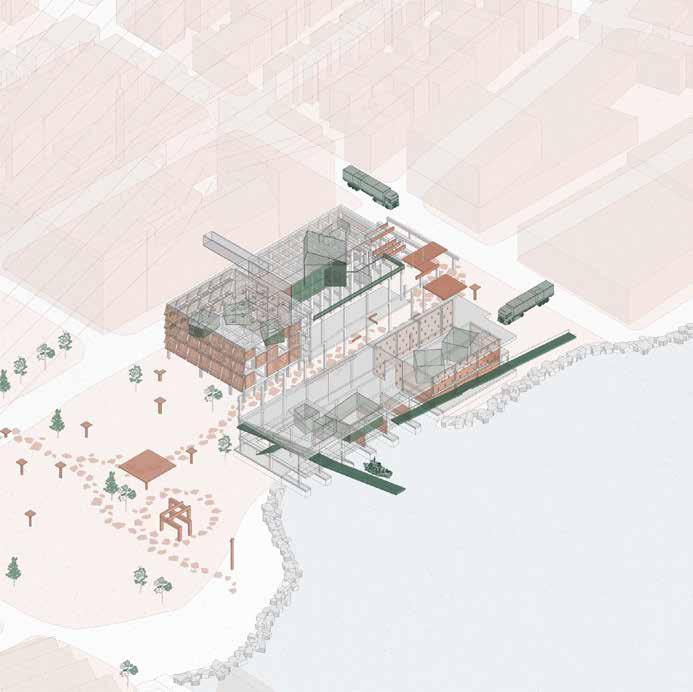 The proposed program of a Centre for Architectural Reuse also builds further on local initiatives, such as the artist run Materialbanken nearby, with the ambition to gather, archive and distribute recycled materials to facilitate reuse amongst creative practices. For the studio prompt this public infrastructure for reuse was coupled with a ferry terminal, facilitating transportation of reused architectural elements by water.