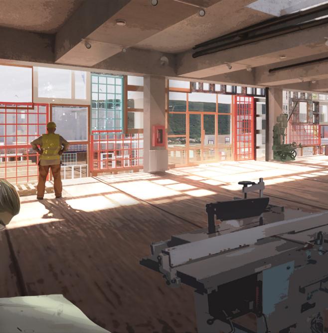 Building D is moved first, becoming the depot and workshop. The remaining part of building C is moved and transformed into more workshop space.
