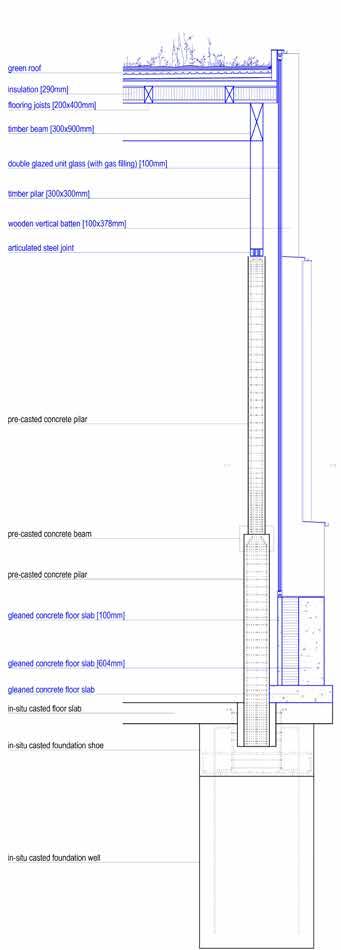 Next spread: Axonometric view, facade detail and section through facade. The blue elements represent the added top-up structure and the black ones refer to the existing one.