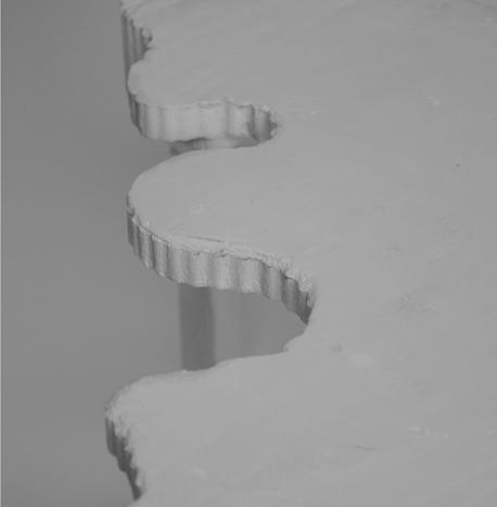 The “White Elefant” deals with decontaminated building material. It is reassembled from cutout concrete slabs. Below: Model images of sitemodel and 1:1 mockups of a wall construction and a lamp.