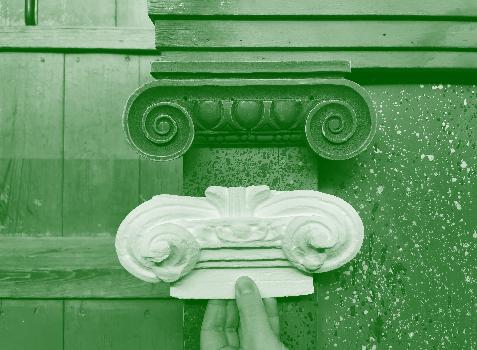 i. 20th-century restoration of the anatomical theater interior (detail) with a photogrammetric scan (Ultimaker print) of the replaced 17thcentury pilaster capital, in Museum Gustavianum, Uppsala, Sweden. Photo by Rose Hallgren. In Unworlding the Anatomical Theater in Uppsala. Malin Heyman (PhD candidate, KTH-A)