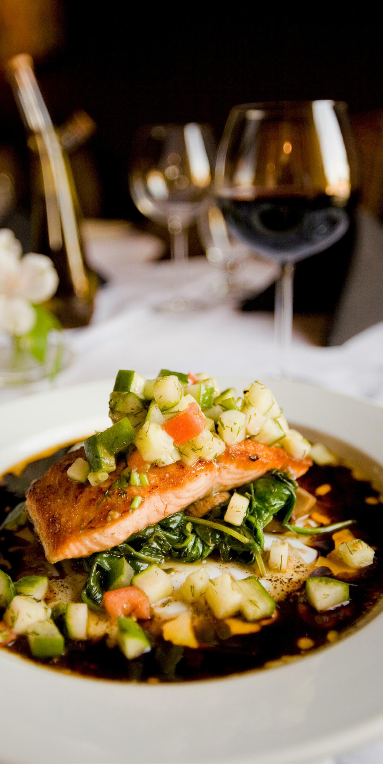 reference the landscape, sun, and water, while music, scent, and lively service create an energetic yet grounded atmosphere. Shared platters, natural textures, and bold plating like Churchill’s Inked Cascade continue to be a hallmark of the style.