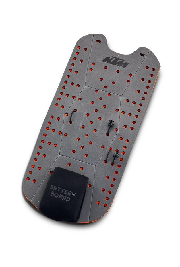 Die CompactPowerTube 400Wh Batterie kann bei allen Modellen nach oben aus dem Rahmen entnommen werden. Der einfache Prozess des Entfernens und Wiedereinsetzens lädt dazu ein, für die lange Tour einen Zweitakku mit dabei zu haben. Genau dafür liefern wir clevere Lösungen aus dem Zubehörbereich: Sowohl die „Sport Trunk Bag”-Satteltasche, als auch das „Battery Board“ für den Rucksack, wurden speziell für das Verstauen des Zweitakkus entwickelt. Eine andere Möglichkeit die Reichweite zu vergrößern, bietet der BOSCH PowerMore Range Extender mit 250 Wh. Dieser kann an den KTM-SXModellen direkt am Akkucover befestigt werden. Die Position der Ladebuchse wurde speziell darauf angepasst. Zusätzlich schützt ein integriertes Schloss den Akku vor Diebstahl.