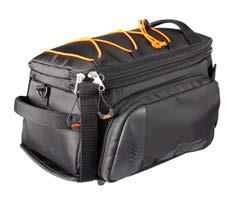 DETAIL Sporty trunk bag for narrow and wide luggage carriers. With premounted adapter plate. Main compartment can be enlarged shoulder strap Rain cover Tightening strap 14 L