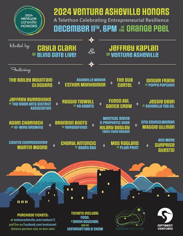 Venture Asheville replaced the annual Venture 15 rankings and award show with the Venture Asheville Honors, a night of honoring the incredible efforts and generosity of people in the ecosystem. In December 2024, 300 members of the ecosystem gathered at the Orange Peel to inspire the beginning of the Asheville comeback.