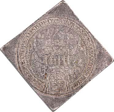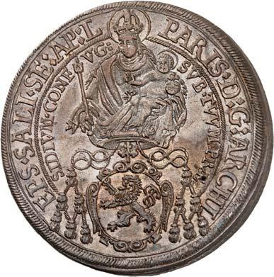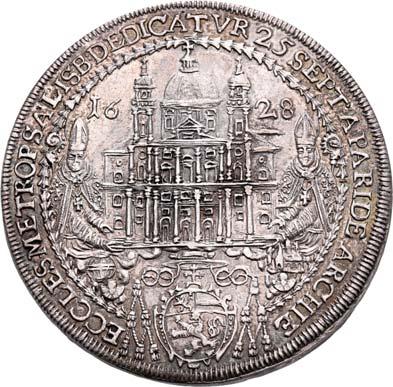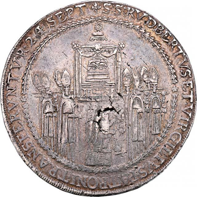 3270Dreifache Schautalerklippe 1928, auf die 300-Jahrfeier der Domweihe. Die beiden Stiftsheiligen St. Rudbertus und St. Virgilius mit ihren Attributen thronen auf Wolken einander gegenüber, die Köpfe nach vorn gewandt, und halten ein Dommodell, zu den Seiten die geteilte Jahreszahl 16 - 28, darunter dreifeldiges Stifts- und Familienwappen des Erzbischofs Paris von Lodron (1619-1653), darüber Kardinalshut mit herabhängenden Quasten zwischen der geteilten Jahreszahl 19 - 28, umher Laubkranz//Dreifeldiges Stifts- und Familienwappen des Erzbischofs Markus Sittikus von Hohenems (1612-1619), zu den Seiten sitzen die beiden Stiftsheiligen St. Rudbertus mit Mitra, Salzgefäß und Krummstab und St. Virgilius mit Mitra, Krummstab und Dommodell, unten zu den Seiten die Signatur A - K (Goldschmied Anton Koppenwallner). Mit drei Punzen auf der Vorderseite. 41,75 x 41,78 mm; 84,72 g. Macho 280.Stempelglanz100,--