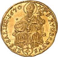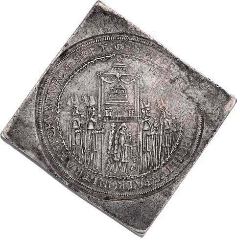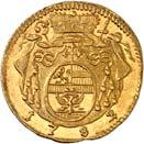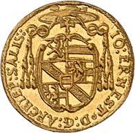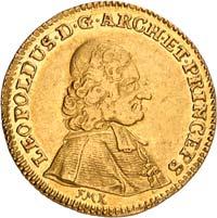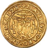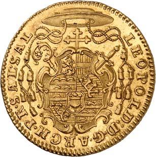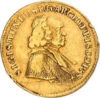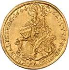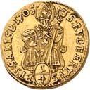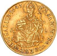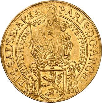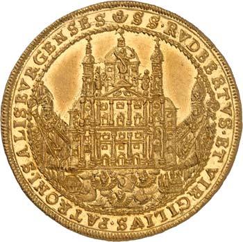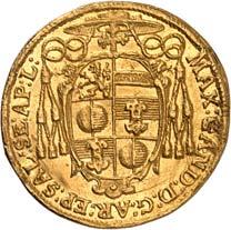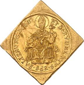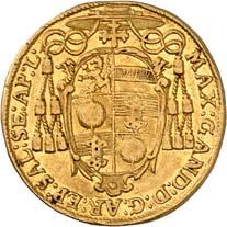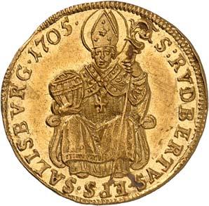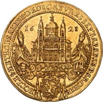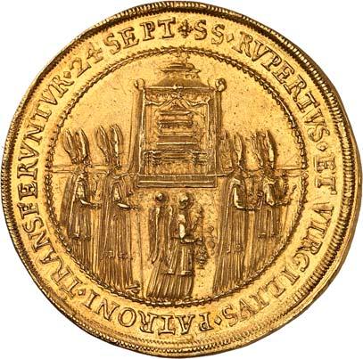 3269Klippenförmige Goldmedaille zu 10 Dukaten 1928, auf die 300-Jahrfeier der Domweihe. Die beiden Stiftsheiligen St. Rudbertus und St. Virgilius mit ihren Attributen thronen auf Wolken einander gegenüber, die Köpfe nach vorn gewandt, und halten ein Dommodell, zu den Seiten die geteilte Jahreszahl 16 - 28, darunter dreifeldiges Stifts- und Familienwappen des Erzbischofs Paris von Lodron (1619-1653), darüber Kardinalshut mit herabhängenden Quasten zwischen der geteilten Jahreszahl 1928, umher Laubkranz//Dreifeldiges Stifts- und Familienwappen des Erzbischofs Markus Sittikus von Hohenems (1612-1619), zu den Seiten sitzen die beiden Stiftsheiligen St. Rudbertus mit Mitra, Salzgefäß und Krummstab und St. Virgilius mit Mitra, Krummstab und Dommodell, unten zu den Seiten die Signatur A - K (Goldschmied Anton Koppenwallner). Mit drei Punzen auf der Rückseite. 41,91 x 41,96 mm; 34,23 g. Macho - (vgl. 275 ff.). In US-Plastikholder der NGC mit der Bewertung MS 65 DPL (6495147-007). GOLD. Polierte Platte1.750,--