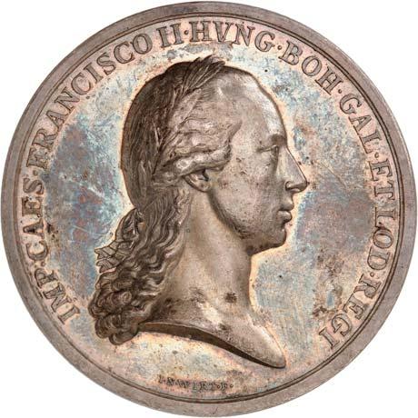 Ehrenmedaille "VIRTUTE ET EXEMPLO" (1790). 5. Modell (mit Inschrift "JOSEPHUS II. AUGUSTUS"), Silberne Medaille I. Klasse, Durchmesser 50,2 mm, Silber, mit StempelschneiderSignatur "I.N.WIRTH.F.F", am späteren Dreiecksband. BWK2 114.II300,--