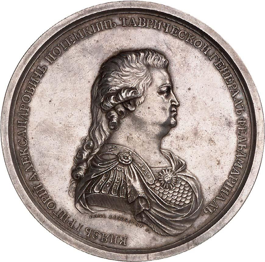 4144 Medaille für den Sieg über die Türken 1770 [ ] (1770). 2. Ausgabe (mit Stempelschneider-Signatur [T.Iwanow], Silberne Medaille, Durchmesser 45,9 mm, Weißmetall (Zinn ?), deutlicher Randschaden, mit Eisenklaue, am neuen St.-GeorgsBand. DIA 149.2. III100,--