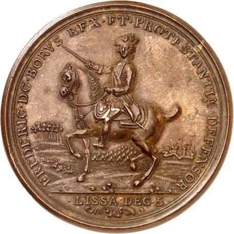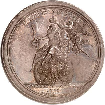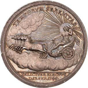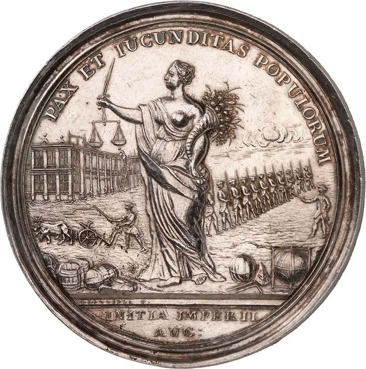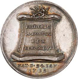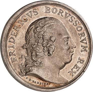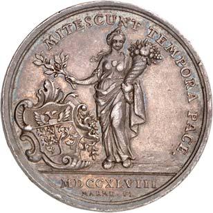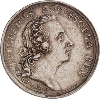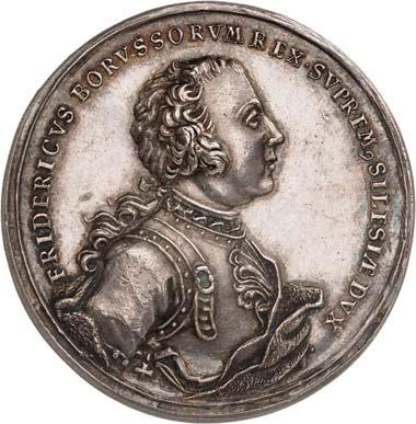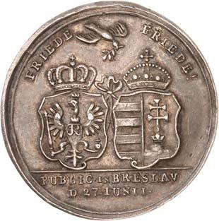 3529 Silbermedaille 1742, von M. Holtzhey, auf den Frieden von Breslau am 11. Juni. Geharnischtes Brustbild r. mit Lorbeerkranz, umgelegtem Mantel und Ordensstern//Pax mit zwei Wappenschilden, Merkurstab und Lorbeerkranz sitzt v. v. auf Wolken, r. zwei antik gekleidete Krieger mit der gefesselten Bellona, im Hintergrund Landschaft und Stadtansicht von Breslau. 48,93 mm; 45,61 g. F. u. S. 4271; Olding 538; Pax in Nummis 522. Von großer Seltenheit. Dunkle Patina, fast vorzüglich1.000,-Exemplar der Auktion Fritz Rudolf Künker 64, Osnabrück 2001, Nr. 4142.