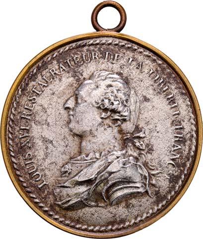 4105 Erinnerungsmedaille auf die Hinrichtung Königin Marie Antoinettes am 16. Oktober 1793 [Médaillon royaliste commémorative de l'éxecution de la reine Marie Antoinette au 16 octobre 1793] (1793). Durchmesser35,3mm,Weißmetall,Buntmetall,hohlgefertigt,imBuntmetallrahmen,ohne Band.II100,--