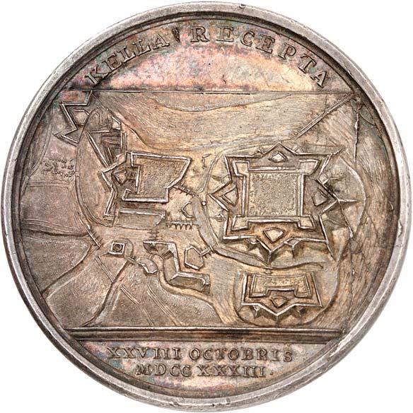 3533 Silbermedaille 1744, unsigniert, von G. W. Kittel, auf die Einnahme von Prag am 16. September. Stadtansicht von Prag//Sieben Zeilen Schrift, oben Waffen, unten Verzierung. 32,14 mm; 10,63 g. F. u. S. 4290; Olding 552.Hübsche Patina, vorzüglich200,--