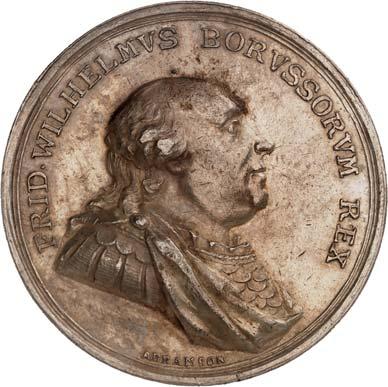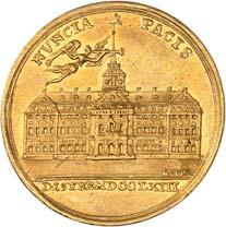 3523Goldmedaille zu 5 Dukaten 1741, unsigniert, von G. W. Kittel, auf die Huldigung der schlesischen Stände in Breslau. Geharnischtes Brustbild r. mit umgelegtem Mantel und Ordenskreuz//Stehende Borussia mit Krone und Zepter empfängt von der vor ihr knienden Silesia die Herzogskrone. 31,81 mm; 17,50 g. F. u. S. 4251; Olding 518 b. GOLD. Von größter Seltenheit. Fast vorzüglich5.000,-Erworben 1989 im deutschen Münzhandel.