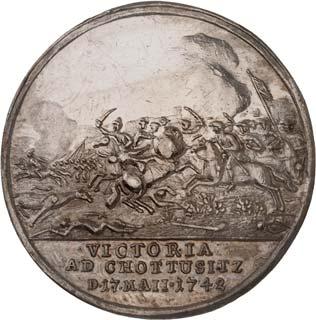 3527 Silbermedaille 1742, unsigniert, von G. W. Kittel, auf die Schlacht bei Chotusitz am 17. Mai. Büste r. mit Lorbeerkranz auf Postament, dahinter auf jeder Seite drei Fahnen und Waffen//Schlachtszene, im Abschnitt drei Zeilen Schrift. 33,49 mm; 13,02 g. F. u. S. 4257; Olding 528 a.Vorzüglich150,-Im Jahr 1742 marschierten österreichische Truppen unter Führung des Herzogs Karl von Lothringen Richtung Prag, um die strategisch und für den Nachschub wichtige böhmische Hauptstadt anzugreifen, die von einer Garnison der mit Preußen verbündeten Bayern gehalten wurde. Friedrich II. stellte sich mit 28.000 Mann eilig der etwa gleich starken österreichischen Armee in den Weg. Am Morgen des 17. Mai 1742 kam es bei Chotusitz (tschech. Chotusice) in Böhmen zur Schlacht, die schon gegen Mittag zugunsten Preußens entschieden war. Während Friedrich 4.778 Mann verlor, zählten die Österreicher 6.332 Verluste. Die Bedrohung Prags war damit vorerst beseitigt und die Versorgung der preußischen Verbände weiterhin gesichert. Der Erfolg bei Chotusitz bot für Preußen eine günstige Verhandlungsposition beim Abschluß des Breslauer Vorfriedens am 11. Juni des Jahres, in dem Maria Theresia ihrem Gegner Friedrich die Grafschaft Glatz, Nieder- und einige Teile Oberschlesiens überließ.