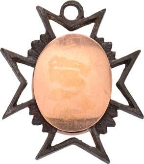 4117 Amtsdekoration wohl für Friedensrichter [Insigne d'office probablement pour un juge de paix]. 48,4 x 41,9 mm, Buntmetall emailliert, Emaille-Malerei, etwas berieben, die Emaille des äußeren Ringes fast vollständig abgesplittert, auf dem Revers zwei Tragebügel.III75,--