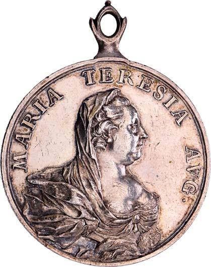 4138 Medaille für die ungarischen Kämpfer im Zweiten Schlesischen Krieg 1744-1745 (?) (1748). Durchmesser 27,2 mm, Silber vergoldet, an alter Bandschleife, im alten beschädigten Sammlungsschächtelchen.