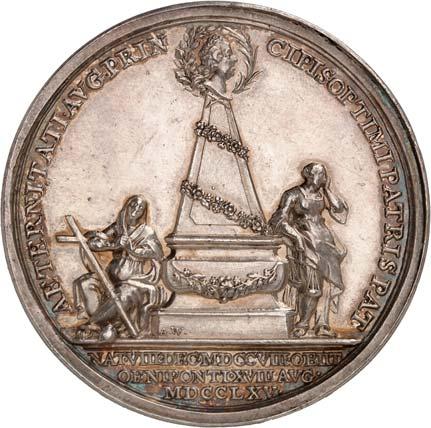 3540Silbermedaille 1747, von G. W. Kittel, auf den Tod des Fürsten Leopold von Anhalt-Dessau am 9 April. Uniformiertes Brustbild Leopolds mit Hut nach l., den Kopf nach vorn gewandt//Trauerpyramide zwischen Kriegstrophäen. 31,69 mm; 13,04 g. Mann 916; Olding 911.Patina, sehr schön +100,--
