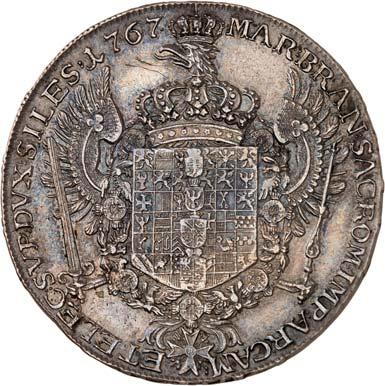 3520Albertustaler (Bancotaler) 1767, ohne Münzzeichen, Berlin. 28,19 g. Geharnischtes Brustbild r. mit umgelegtem Mantel, Ordensband und Kreuz//Gekröntes, 41feldiges Wappen mit aufgelegtem Andreaskreuz. Mit Kerbrand. Dav. 2594; Kluge 322.2; Olding 373. RR Hübsche Patina, sehr schön3.000,-Erworben 1988 bei der Frankfurter Münzhandlung.