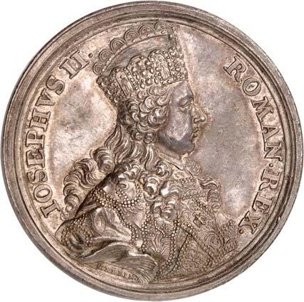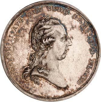 Ehrenmedaille "VIRTUTE ET EXEMPLO" (1790). 1. Modell (Avers mit Umschrift "IOSEPHUS II.D.G.ROM.REX.S.A.GERM.REX HUNG.BOH.&C.PRIN.HERED.A.A.&C"), Kleine silberne Medaille, Durchmesser 46,1 mm, Silber, ohne Band. BWK1 101.II250,--