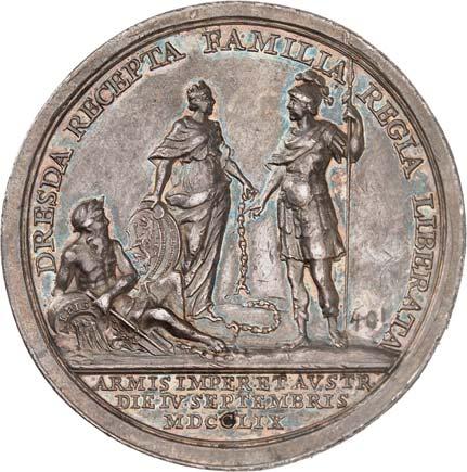 3542 Silbermedaille 1756, von M. und J. G. Holtzhey, auf die Kapitulation der sächsischen Truppen bei Pirna am 15. Oktober. Geharnischtes Brustbild r. mit Lorbeerkranz, umgelegtem Mantel und Ordensband//Perseus mit Schild und Medusenhaupt steht v. v. zwischen der nach r. sitzenden Saxonia mit Wappenschild und drei besiegten Kriegern. 48,61 mm; 41,78 g. F. u. S. 4345; Olding 598.