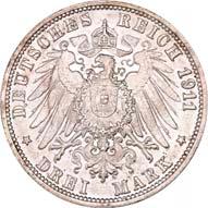 4123 Wilhelm II., 1891-1918. 3 Mark 1911. Silberhochzeit. J. 177a.Vorzüglich-Stempelglanz20,-41243 Mark 1911. Silberhochzeit. - Hoher Querstrich im H -. J. 177b.Vorzüglich-Stempelglanz150,--
