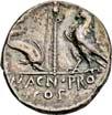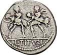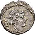3013Õ-Denar, 137 v. Chr., Rom, Sextus Pompeius Fostlus; 3,83 g. Romakopf r. mit geflügeltem Helm, davor X, dahinter einhenkliges Gefäß//Wölfin säugt Romulus und Remus, dahinter Faustulus, im Hintergrund Feigenbaum (ficus Ruminalis). Bab. 1; BMC 927; Crawf. 235/1 c; Syd. 461 a. Min. Feilspur am Rand, kl. Stempelfehler auf dem Avers, sonst fast vorzüglich60,-Die Familie führte ihren Ursprung auf Faustulus zurück, den Hirten, der die Wölfin mit den Zwillingen gefunden hatte. So war die Familie, obgleich plebeischer Herkunft, doch mit der Gründung Roms verbunden.