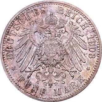 4122 Friedrich, 1893-1918. 5 Mark 1903. J. 171.Feine Tönung, vorzüglich-Stempelglanz2.000,--