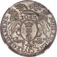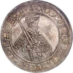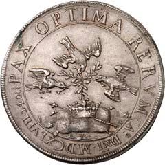 4501 Unter Schweden. Christina, 1632-1654. Silbermedaille 1643, von J. Höhn. Gedenkprägung der Stadt Riga auf die schwedische Königin Christina. Brustbild der designierten Königin in reich verzierter Tracht und mit Strahlenkrone fast v. v.//Zwei Löwen halten das gekrönte, vierfeldige schwedische Reichswappen mit Mittelschild. 39,65 mm; 23,01 g. Hildebrand I, S. 262, 14 a. RR Hübsche Patina, fast vorzüglich500,-Auf der Rückseite der vorliegenden Medaille finden sich neben den Initialen des Medailleurs Johann Höhn ungewöhnlicherweise auch die Initialen des Rigaer Münzmeisters Hendrik Wulf.
