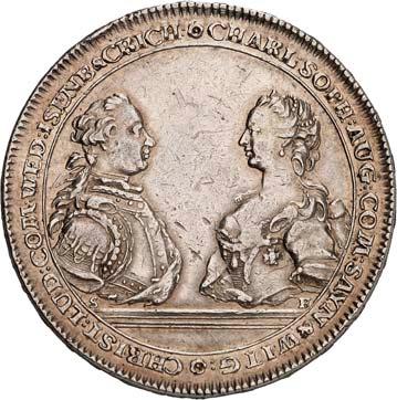 4526 Christian VI., 1730-1746. Silbermedaille 1732, von J. C. Hedlinger, auf die Stiftung des Ordens "L'union parfaite", durch seine Gemahlin, Sophie Magdalene, anläßlich ihres 11. Hochzeitstages. Die beiden Brustbilder des Königspaares nebeneinander r., der König mit umgelegtem Elefantenorden, darunter die Stempelschneidersignatur//Ordenskreuz. 56,56 mm; 89,39 g. Felder 127; Fischer/Maué 2.277; Galster 372; Slg. Wilm. 722. RR Feine Patina, winz. Randfehler, vorzüglich1.500,-Exemplar der westfälischen Privatsammlung „Mehrfachportraits auf Münzen und Medaillen".