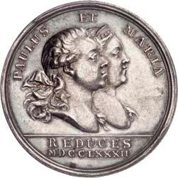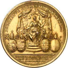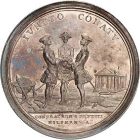 4528 Silbermedaille 1745, von P. Chr. Winslow, auf die Geburt des Kronprinzen Christian am 7. Juli. Brustbilder des Elternpaares, Kronprinz Frederik (später König Frederik V.) mit Elefantenorden und Louise, Tochter Georgs II. von Braunschweig-Calenberg-Hannover, König von Großbritannien, nebeneinander r.//Die personifizierte Beständigkeit (Constantia) steht fast v. v., den Kopf nach l. gewandt, im rechten Arm hält sie den neugeborenen Kronprinzen, in der linken Hand Kugel, darauf Phönix; im Hintergrund der dänische Elefant und die gekrönten Schilder von Oldenburg und Dänemark. 57,92 mm; 85,43 g. Brockmann 988; Coll. Northumberland 171; Galster 402. R Vorzüglich-Stempelglanz1.000,-Exemplar der westfälischen Privatsammlung „Mehrfachportraits auf Münzen und Medaillen".