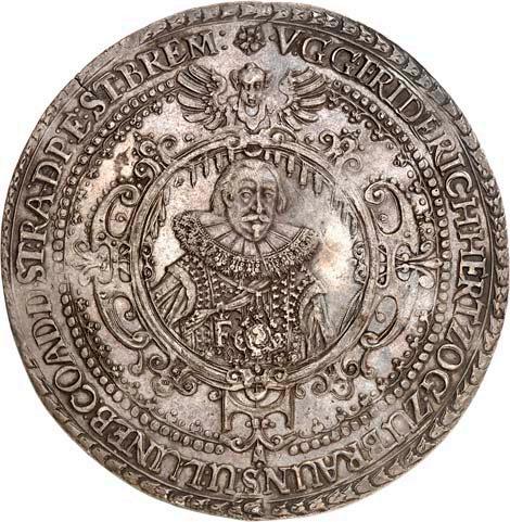 4514 Frederik III., 1648-1670. Silbermedaille o. J., unsigniert, von J. Hercules, auf das oldenburgische Königshaus. Geharnischtes Brustbild r. mit Lorbeerkranz und umgelegtem Mantel//Sieben gekrönte Kartuschen mit den Porträts der früheren Herrscher des Hauses Oldenburg, in der Mitte vier Zeilen Schrift. 57,16 mm; 53,66 g. Coll. Northumberland 15; Galster 86. Von großer Seltenheit. Kl. Kratzer, winz. Prüfspur am Rand, fast vorzüglich2.500,-Exemplar der westfälischen Privatsammlung „Mehrfachportraits auf Münzen und Medaillen".