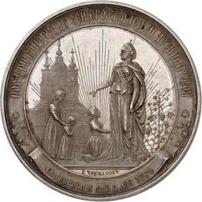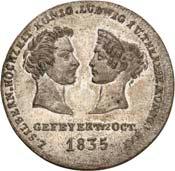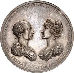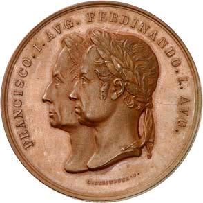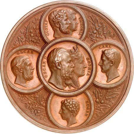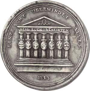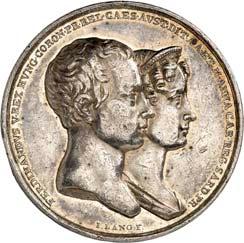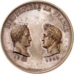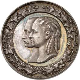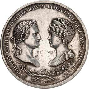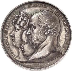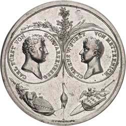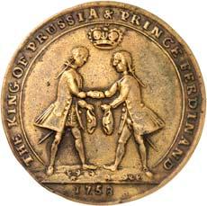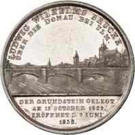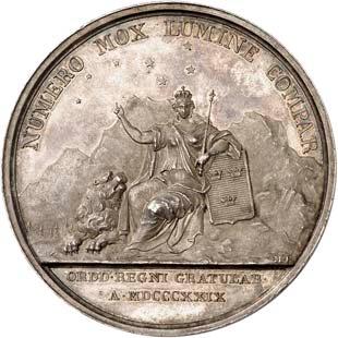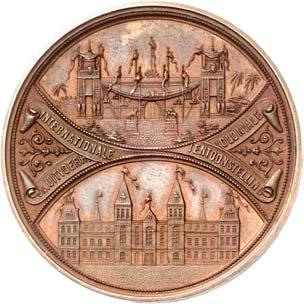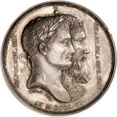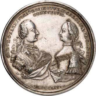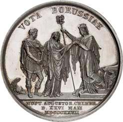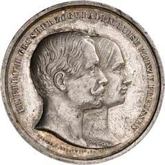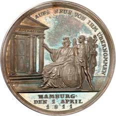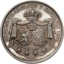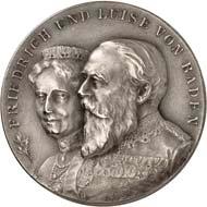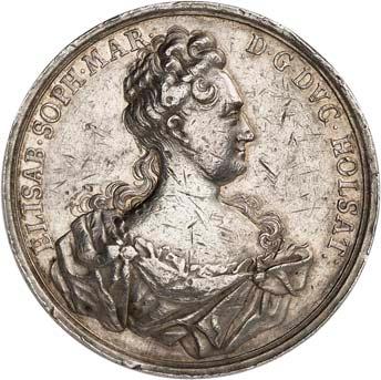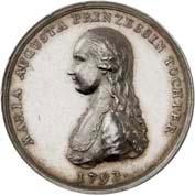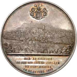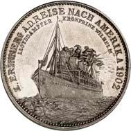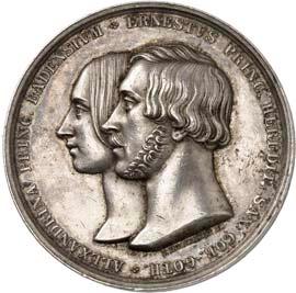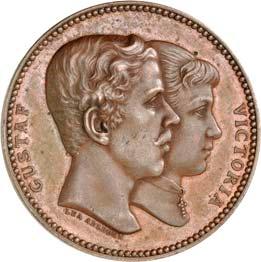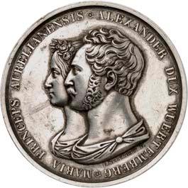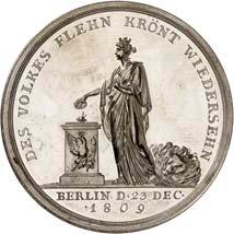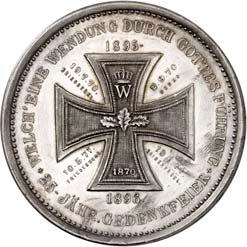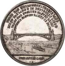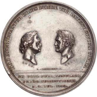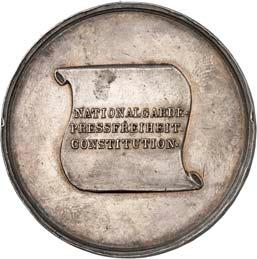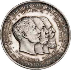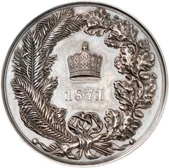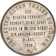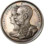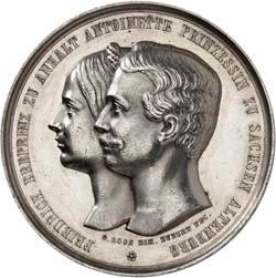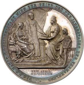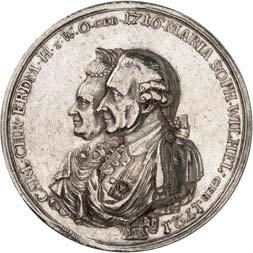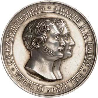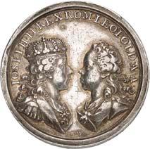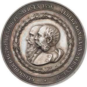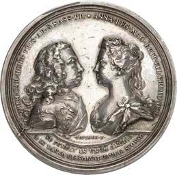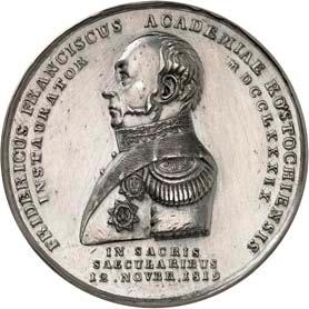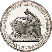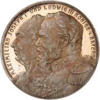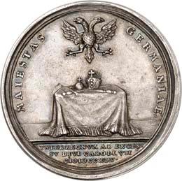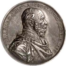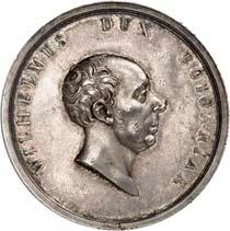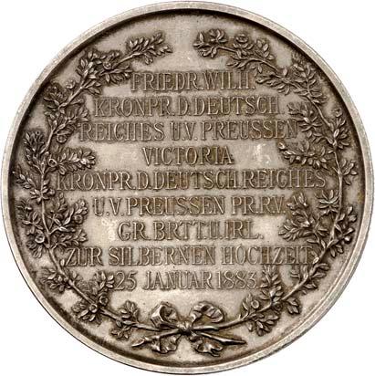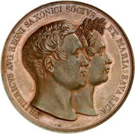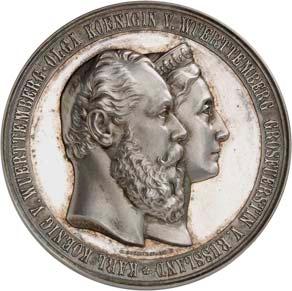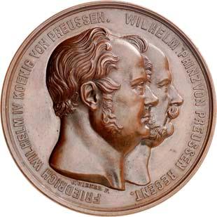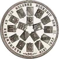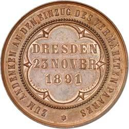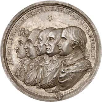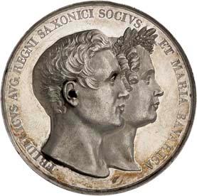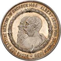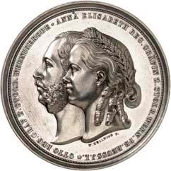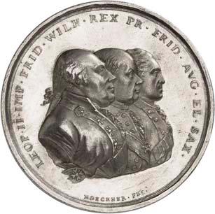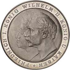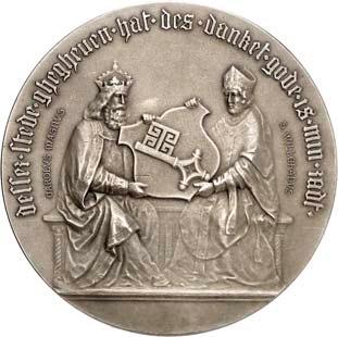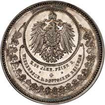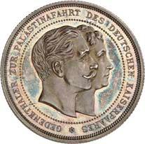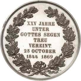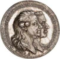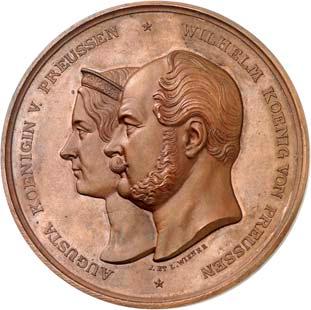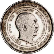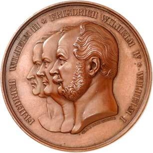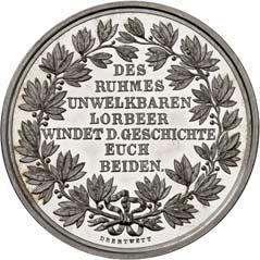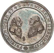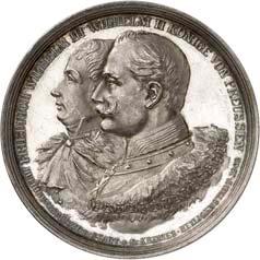 2140 Von Bismarck, Otto, Fürst. *1815 Schönhausen, Ó1898 Friedrichsruh. Deutscher Reichskanzler. Silbermedaille 1893, von O. Bergmann, auf seinen 78. Geburstag. Brustbild des Fürsten Bismarck und seiner Gemahlin fast v. v.//Gekröntes Wappen zwischen Eichenzweigen. 34,88 mm; 14,90 g. Bennert II, 104.Von polierten Stempeln, winz. Kratzer, vorzüglich-Stempelglanz100,-2141Lot. Kleine Sammlung von Silbermedaillen, geprägt auf Fürst Otto von Bismarck. 6 Stück. Vorzüglich-Stempelglanz100,-2142 von Goethe, Johann Wolfgang. *1749 Frankfurt, Ó1832 Weimar. Deutscher Dichter. Bronzemedaille o. J. (1856), von H. F. Brandt, auf den 50-jährigen Aufenthalt Goethes in Weimar. Büsten Großherzogs Carl August und seiner Gemahlin Luise nebeneinander r.//Büste Goethes l. umher Lorbeerzweige. Ohne Randschrift. 41,46 mm; 46,39 g. Frede 75 b.aa. R Hübsche Kupferpatina, winz. Kratzer, vorzüglich-Stempelglanz100,--