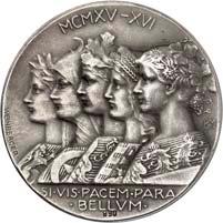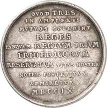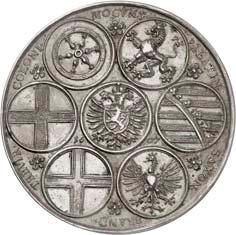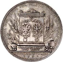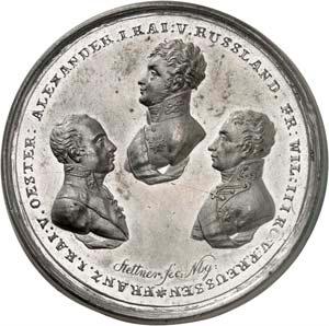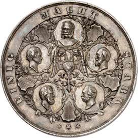 Silbermedaille 1916, von A. Weinberger, auf das Viererbündnis zwischen Deutschland, ÖsterreichUngarn, Bulgarien und der Türkei. Brustbilder Wilhelms II. und Franz Josephs I. nach r., gegenüber die Brustbilder Ferdinands I. sowie Sultan Mohammeds V.//Fünf gestaffelte Brustbilder der weiblichen Personifikationen der verbündeten Länder nach l. Mit Punze: SILBER 990. 33,55 mm; 15,63 g. Zetzmann 3048. Von großer Seltenheit. Mattiert, vorzüglich 600,-2158Zinkmedaille 1916, von A. Weinberger, auf das Viererbündnis zwischen Deutschland, ÖsterreichUngarn, Bulgarien und der Türkei. Brustbilder Wilhelms II. und Franz Josephs I. nach r., gegenüber die Brustbilder Ferdinands I. sowie Sultan Mohammeds V.//Fünf gestaffelte Brustbilder der weiblichen Personifikationen der verbündeten Länder nach l. 60,73 mm; 91,29 g. Zetzmann 3048 (dort in Silber). Mattiert. Vorzüglich75,--