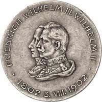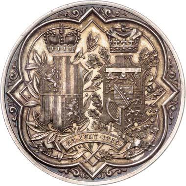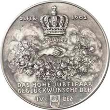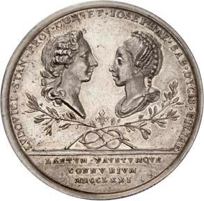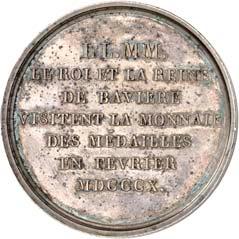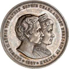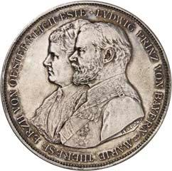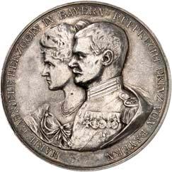 Silbermedaille 1910, auf die Vermählung des Kronprinzen Ludwig von Bayern mit Therese und das 100jährige Jubiläum des Oktoberfestes in München. Brustbilder des Kronprinzenpaares und des Prinzregenten Luitpold von Bayern nebeneinander l.//Wappenbaum, dahinter zwei Reiter. Mit Randpunze: BAYER. HAUPTMÜNZAMT. FEINSILBER. 32,91 mm; 20,15 g. Kienast 13.