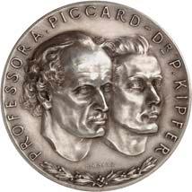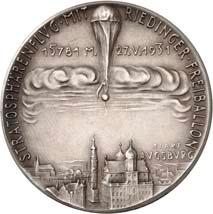 Silbermedaille 1931, auf den 1. Aufstieg in die Stratosphäre durch Prof. Auguste Piccard, *1884 Lutry (Kt. Waadt), Ó1962 Lausanne, und seinen Assistenten Dr. P. Kipfer. Beider Köpfe nebeneinander halbr.//Der in Augsburg hergestellte Stratosphärenballon beim Aufstieg, unten Stadtansicht von Augsburg mit Rathaus. Mit Randpunze auf vertieftem Untergrund: BAYER. HAUPTMÜNZAMT. FEINSILBER. 36,17 mm; 19,70 g. Kaiser 124.4; Kienast 462.Mattiert. Fast prägefrisch 150,--