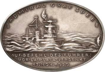 2136Silbermedaille 1939, auf die Versenkung der "Admiral Graf Spee" durch Befehl des Führers bei La Plata. Brustbilder von Admiral Graf Spee und Kapitän Hans Langsdorff v. v.//Das sinkende Schiff in hoher See. 60,26 x 41,35 mm; 42,12 g. Kienast 565. Von großer Seltenheit. Mattiert. Fast prägefrisch 750,--