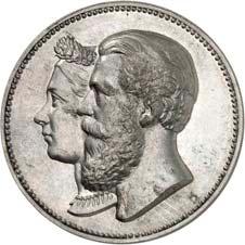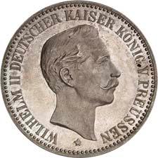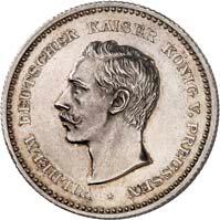 2170 Friedrich III., 1888. 5 Mark 1888, glatter Rand. Zinn. 38,22 mm; 20,00 g. Brustbilder des Kaisers und seiner Gemahlin Victoria l.//Gekrönter Reichsadler. Schaaf 99 G 1; Slg. Beckenbauer -; zu J. 99. RR Von korrodierten Stempeln, fast vorzüglich300,--