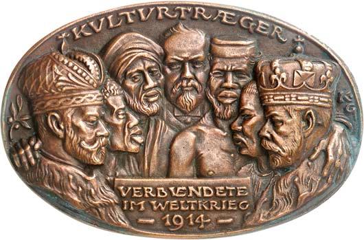 2115Ovale Bronzegußmedaille 1914, auf die "Kulturträger" und Verbündeten im 1. Weltkrieg gegen Deutschland. Die sieben Verbündeten im Halbkreis//Acht Zeilen Schrift. 90,44 x 59,80 mm; 108,78 g. Kienast 140. Vorzüglich200,--